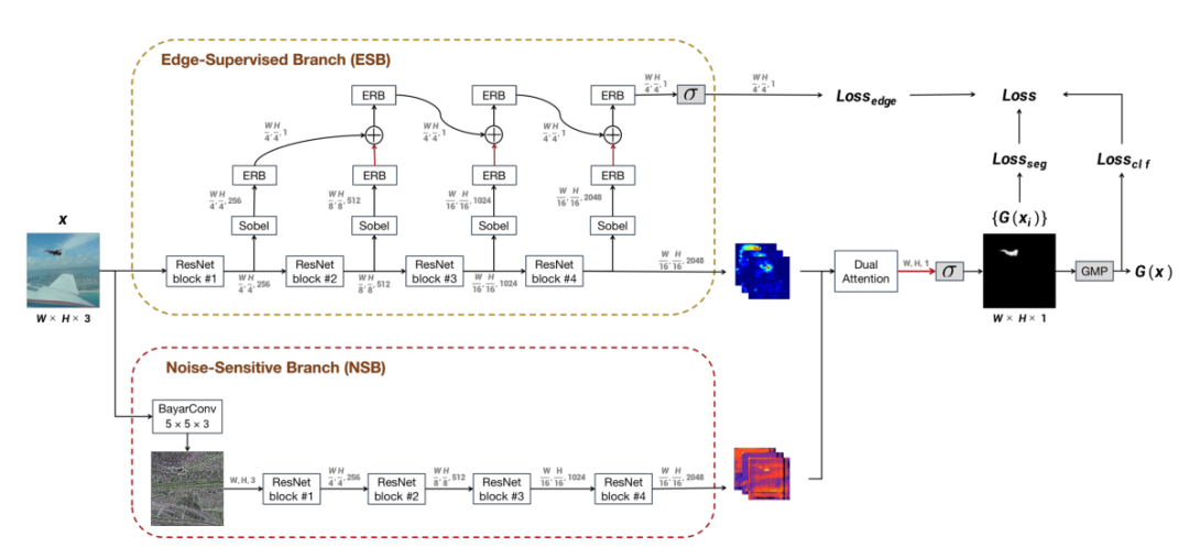 如图1所示,MVSS-Net由两个以ResNet-50为主干的分支组成。上方的边缘监督分支(edge-supervision branch, ESB)用于捕捉篡改区域与未篡改区域在边界处的微小差异;下半部分的噪声敏感分支(noise sensitive branch, NSB)旨在捕获篡改区域和未篡改区域之间的噪声不一致性。边界差异和噪声不一致都是语义无关的特征。