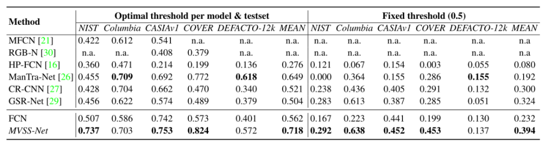 表 2:与SOTA方法对比像素级F1(CASIAv2训练,公共数据集测试)