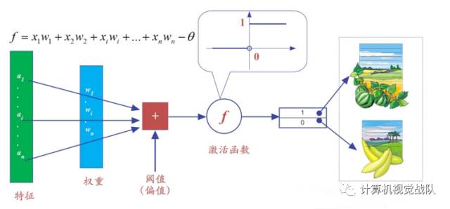 假设特征x1代表输入颜色,特征x2代表形状,权重w1和w2默认值都为1,为了进一步简化,我们把阈值θ(亦有教程称之为偏值——bias)设置为0。为了标识方便,我们将感知器输出为“1”,代表判定为“西瓜”,而输出为“0”,代表判定为“香蕉”。当然了,如果有更多类别的物品,我们就用更多的数字来标记即可。