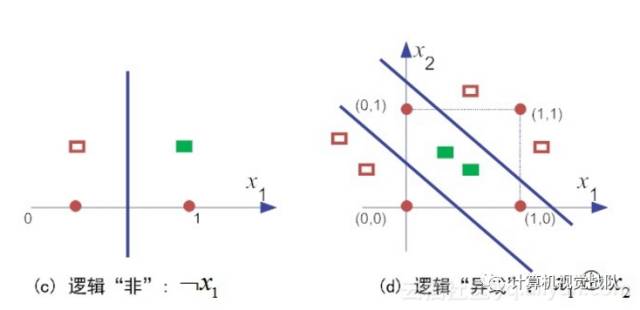 图5-6 线性可分的“与、或、非”和线性不可分的“异或”