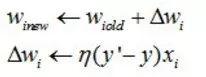 如此一来,感知机的学习规则就可以更加简单明了,对于训练样例(x,y)(需要注意的是,这里粗体字x表示训练集合),若当前感知机的实际输出y’,假设它不符合预期,存在“落差”,那么感知机的权值依据如公式(5.2)规则调整: