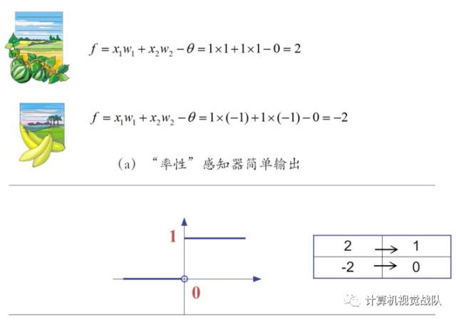 这样一来,可以很容易依据图5-1所示的公式,对于西瓜、香蕉做鉴定(即输出函数f的值),其结果分别如图5-2(a)所示: