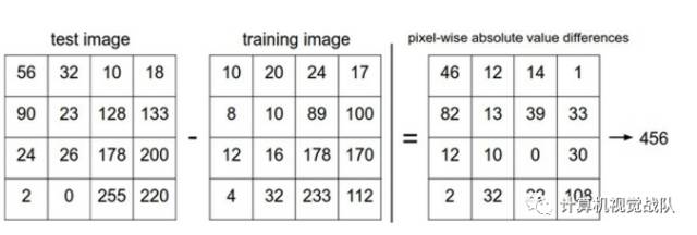 以图片中的一个颜色通道为例来进行说明。两张图片使用L1距离来进行比较。逐个像素求差值,然后将所有差值加起来得到一个数值。如果两张图片一模一样,那么L1距离为0,但是如果两张图片很是不同,那L1值将会非常大。