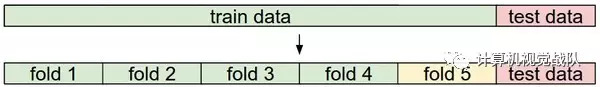 常用的数据分割模式。给出训练集和测试集后,训练集一般会被均分。这里是分成5份。前面4份用来训练,黄色那份用作验证集调优。如果采取交叉验证,那就各份轮流作为验证集。最后模型训练完毕,超参数都定好了,让模型跑一次(而且只跑一次)测试集,以此测试结果评价算法。