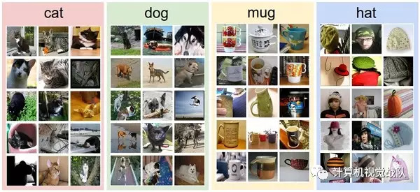 一共有4个类别的训练集。在实际中,可能有成千上万类别的物体,每个类别都会有百万的图像。