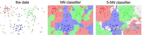 上面示例展示了Nearest Neighbor分类器和5-Nearest Neighbor分类器的区别。例子使用了2维的点来表示,分成3类(红、蓝和绿)。不同颜色区域代表的是使用L2距离的分类器的决策边界。白色的区域是分类模糊的例子(即图像与两个以上的分类标签绑定)。需要注意的是,在NN分类器中,异常的数据点(比如:在蓝色区域中的绿点)制造出一个不正确预测的孤岛。5-NN分类器将这些不规则都平滑了,使得它针对测试数据的泛化(generalization)能力更好(例子中未展示)。注意,5-NN中也存在一些灰色区域,这些区域是因为近邻标签的最高票数相同导致的(比如:2个邻居是红色,2个邻居是蓝色,还有1个是绿色)。