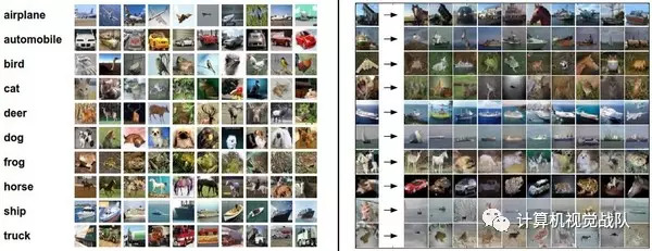 左边:从CIFAR-10数据库来的样本图像。右边:第一列是测试图像,然后第一列的每个测试图像右边是使用Nearest Neighbor算法,根据像素差异,从训练集中选出的10张最类似的图片。