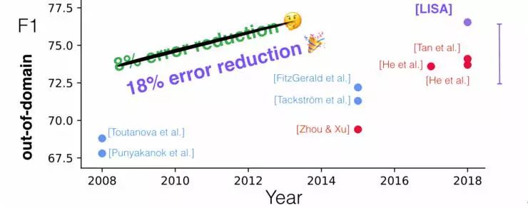 PropBank语义角色标注的十年。语言学信息的自我注意力( LISA )与其他域外数据方法的比较。 (Strubell et al., 2018)