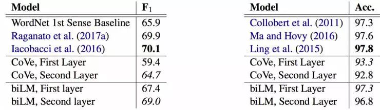 这篇论文介绍了 ELMo,颇受好评。除了实证结果让人印象深刻,这篇论文的详细的分析部分也非常显眼,该部分梳理了各类因素的影响,并且分析了在表示中所捕获的信息。词义消歧(WSD)分析自身(下图左)也执行得很好。这两者都表明,机器学习本身就提供了接近最新技术的词义消歧和词性标注性能。