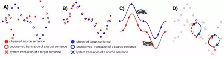 无监督机器翻译三项原则的插图说明:A)两个单语数据集;B)初始化;C)语言建模;D)反向翻译 (Lample et al., 2018)。