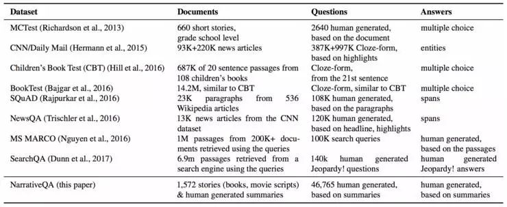 这篇论文基于对完整的电影剧本和书籍的提问和回答,提出了一个具有挑战性的新的问答数据集。虽然依靠当前的方法还无法完成这项任务,但是模型可以选择使用摘要(而不是整本书籍)作为选择答案(而不是生成答案)的语境。这些变体让任务的实现更加容易,也使得模型可以逐步扩展到整个语境设置。