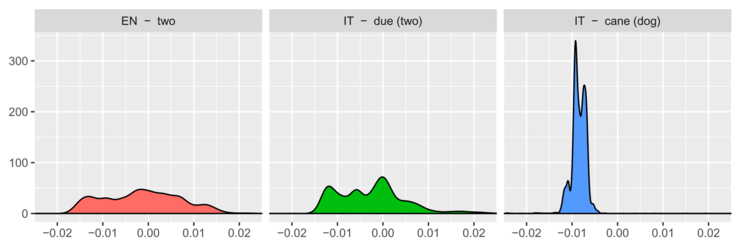 三个词的相似度分布。 等效翻译(「two」和「due」)的分布比非相关词(「two」和「cane」——意思是「dog」)的分布更为相似。(Artexte et al., 2018)
