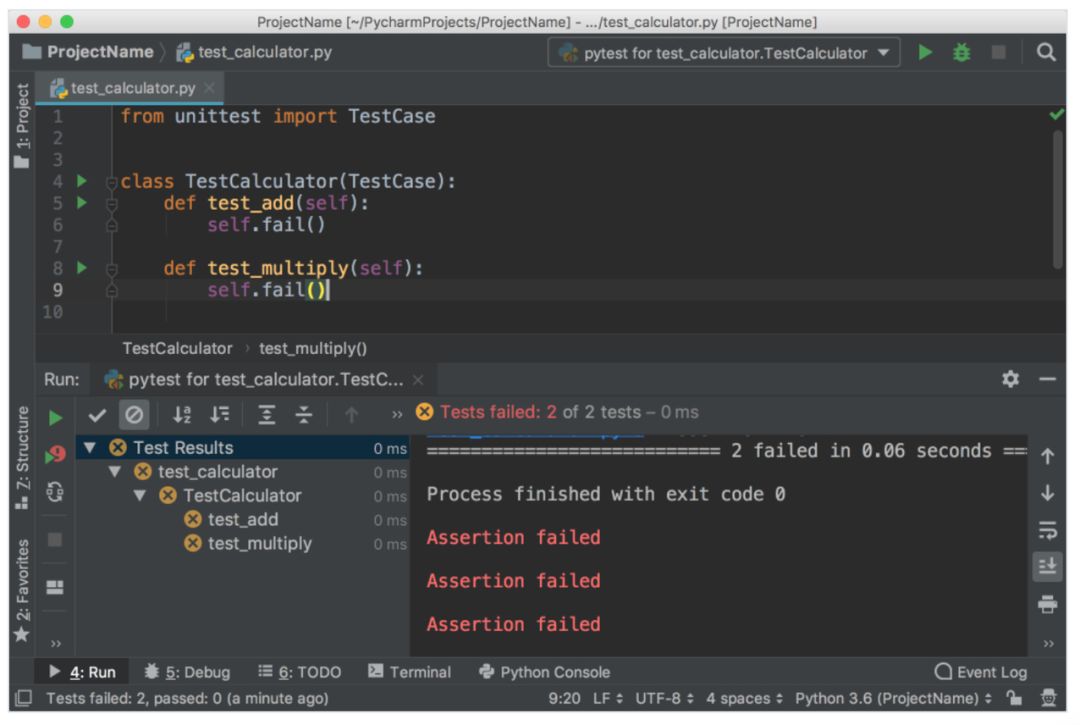 注意,左侧是测试结果的层次结构,右侧是终端的输出。现在,将代码更改成以下代码,实现 test_add:
