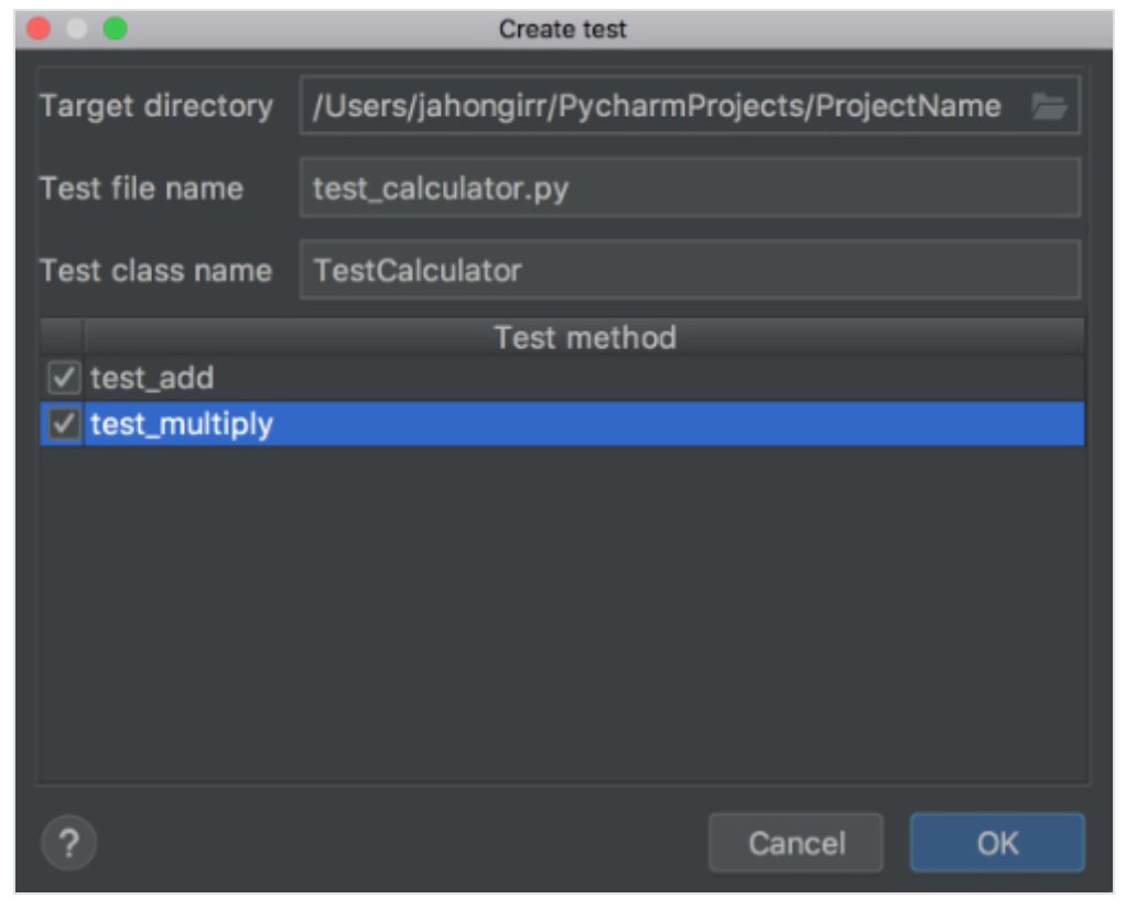 Target directory、Test file name 和 Test class name 这三项均保留默认设置。选中上图中两种需要测试的方法并点击 OK。好了!PyCharm 自动创建文件 test_calculator.py,并在其中创建了以下 stub test: