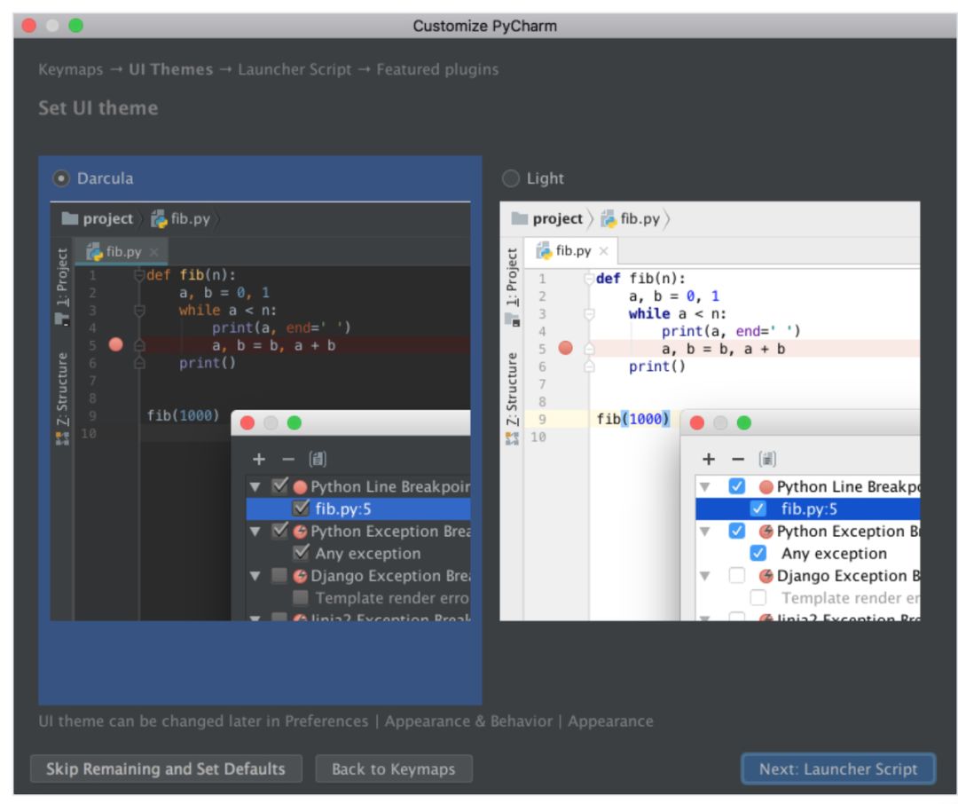 PyCharm 将询问选择深色模式 Darcula 还是浅色模式。你可以选择自己喜欢的模式,并点击「Next: Launcher Script」: