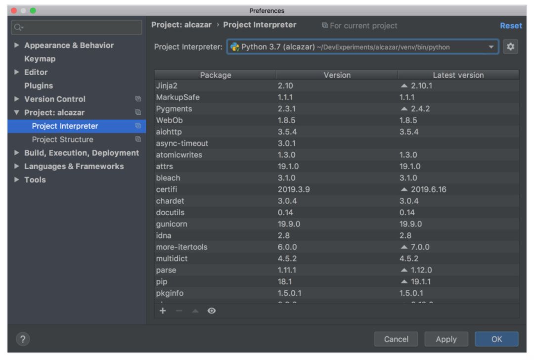 如果你需要配置不同的虚拟环境 virtualenv,在 Mac 上打开 Preferences,或在 Windows 或 Linux 系统中使用 Ctrl+Alt+S 打开 Settings,找到 Project: ProjectName。打开下拉列表,选择 Project Interpreter: