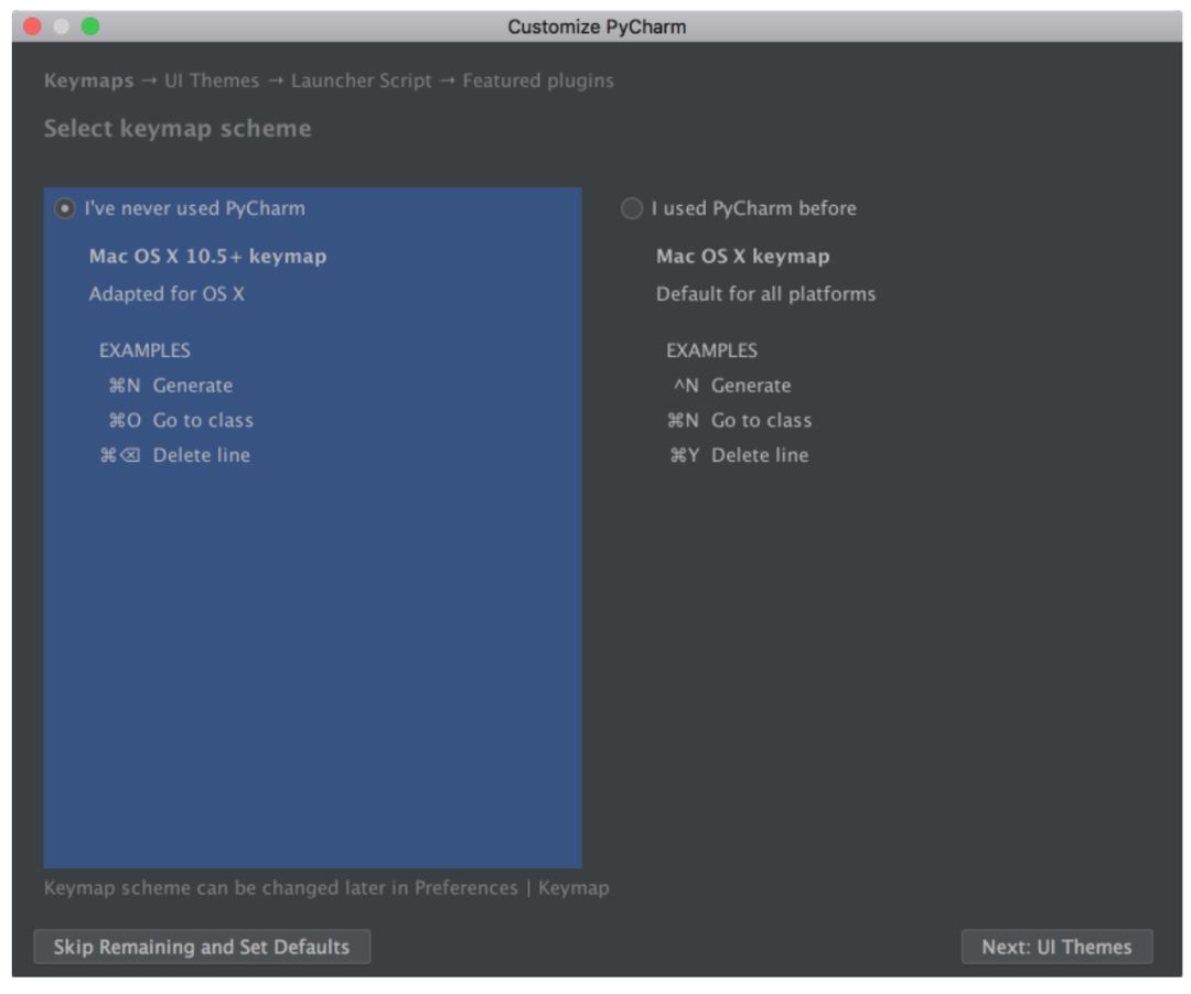 启动 PyCharm,你将看到导入设置弹窗。PyCharm 会自动检测出这是首次安装,并为你选择「Do not import settings」选项。点击 OK,之后 PyCharm 会让你选择键盘映射(keymap scheme)。保留默认设置,点击右下角的「Next: UI Themes」: