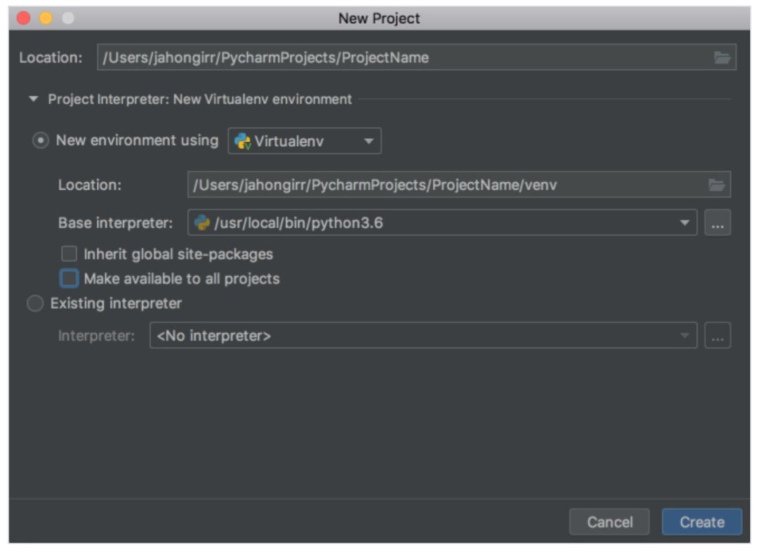 你可以选择其中任意一个,本教程使用的是 Virtualenv。选择后,指定环境位置,从 Python 解释器列表中选择要安装在系统中的 base interpreter。通常,保持默认设置即可。下面有两个可选框:在新环境中继承全局包环境、令当前环境可以用其它所有项目,两个都不要选。