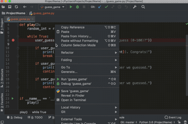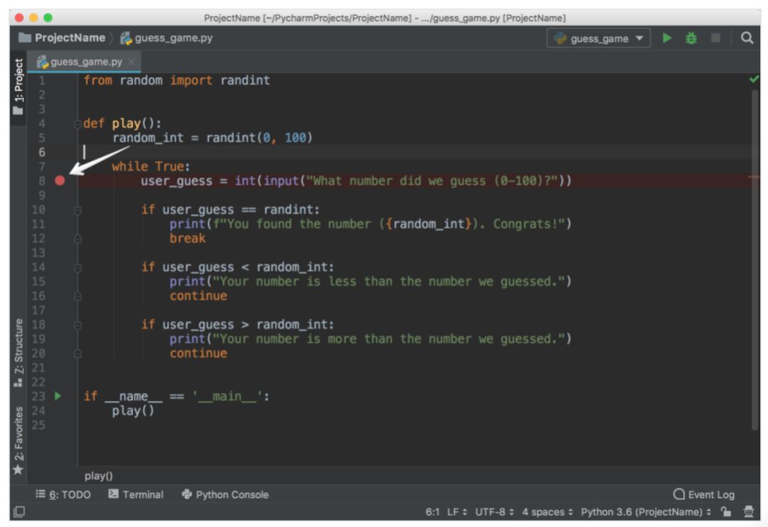 点击__main__从句左侧的绿色小箭头,选择「Debug 『guess_game』」。