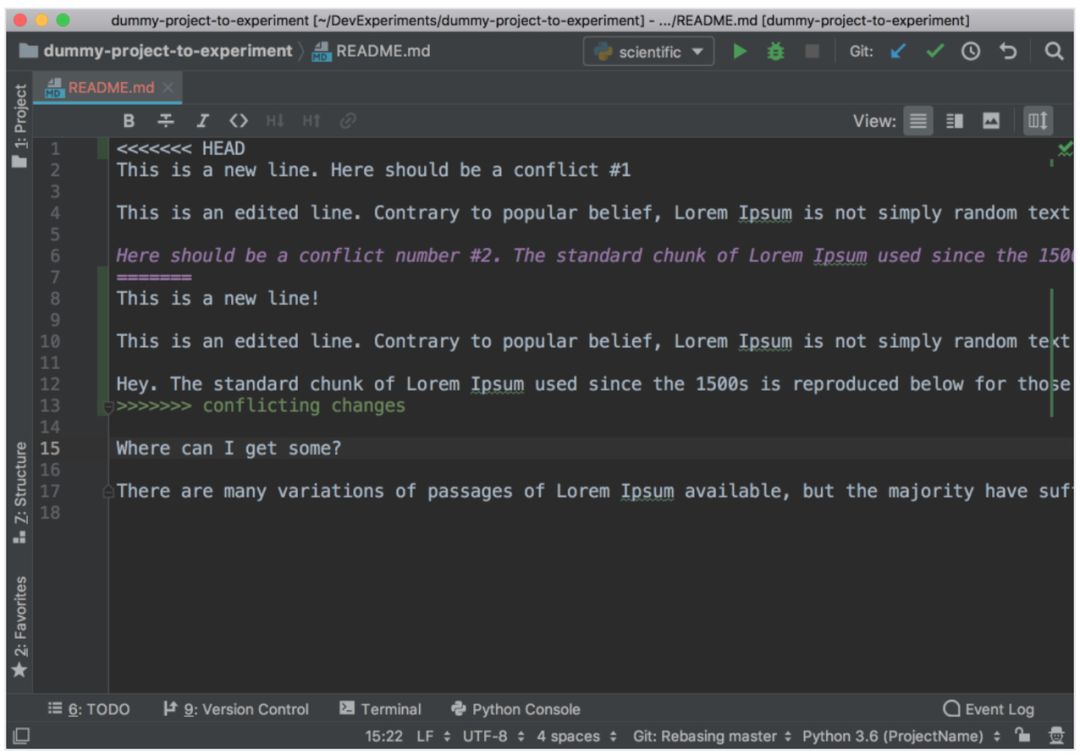 看起来很奇怪,我们很难分辨应该删除哪些更改、保留哪些更改。不要怕,PyCharm 来了!它可以用更好、更简洁的方法解决冲突。在顶部菜单中前往 VCS,选择 Git,然后选择 Resolve conflicts…。选择存在冲突的文件,点击 Merge,出现以下窗口: