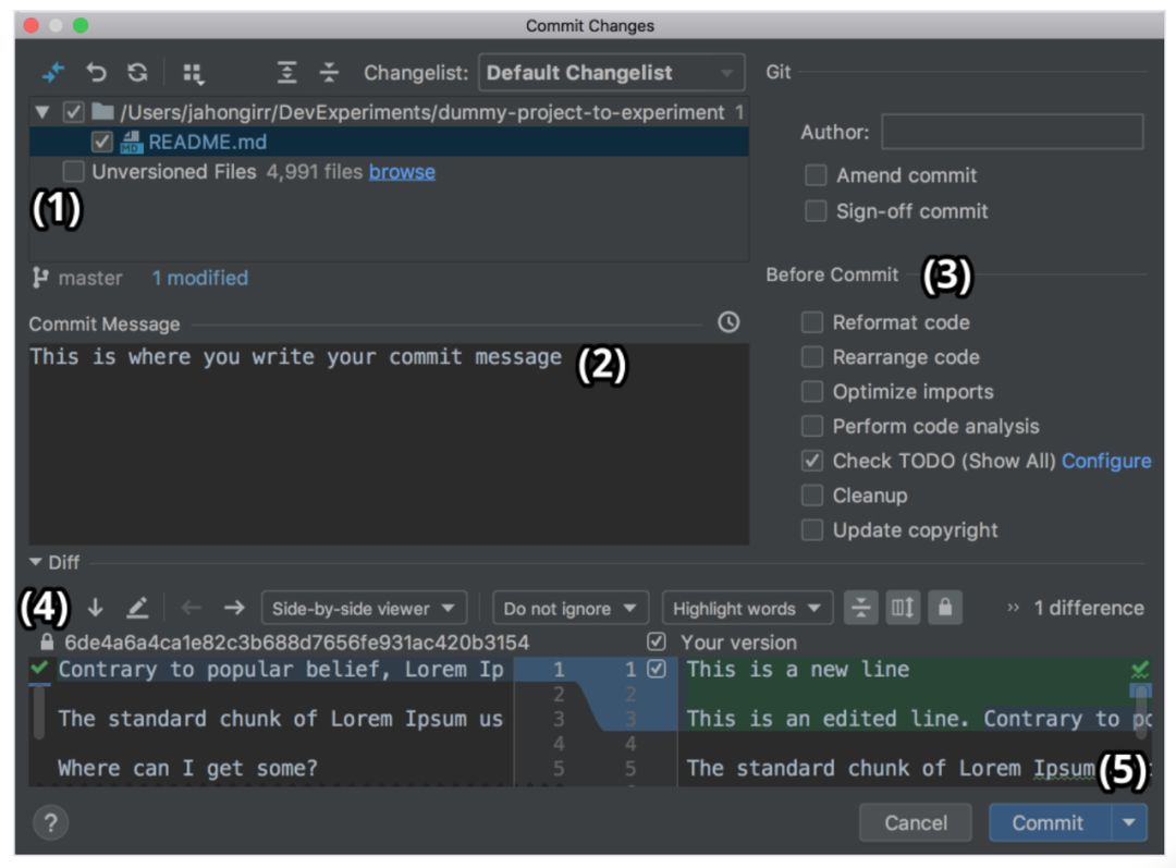 这是 PyCharm 中 VCS 集成的两大特征,我个人经常使用并且非常喜欢。假如你完成了工作,打算提交,前往 VCS → VCS Operations Popup… → Commit…,或者在 Mac 系统中使用 Cmd+K 键,在 Windows 或 Linux 系统中使用 Ctrl+K 键。你将看到如下窗口: