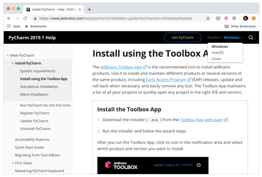 Toolbox App 安装指南,参见 JetBrains 官方文档:https://www.jetbrains.com/help/pycharm/installation-guide.html#toolbox。