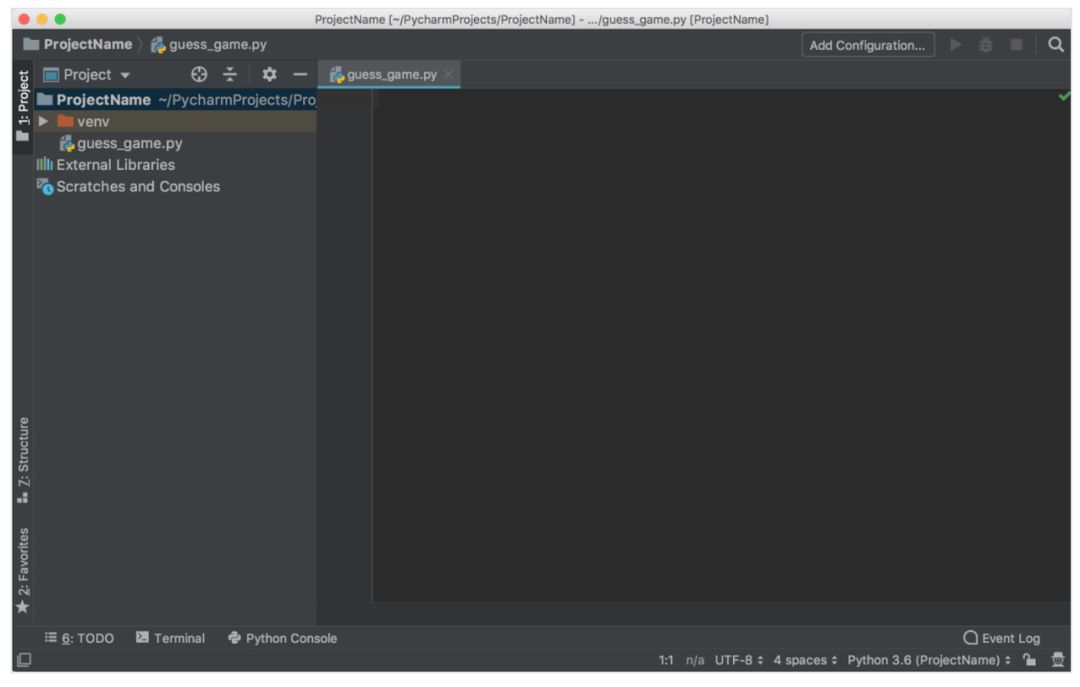 现在我们可以开始新的 Python 程序了。如果你使用的是 Mac 系统,使用 Cmd+N 键;如果你使用的是 Windows 或 Linux 系统,使用 Alt+Ins 键。然后选择 Python File。你也可以在菜单中选择 File → New。将新文件命名为 guess_game.py 并点击 OK。你将看到如下 PyCharm 窗口: