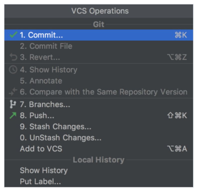 这时如果你前往 VCS Operations Popup…,你会发现一个不同的弹窗,它具备选项 git add、git stash、git branch、git commit、git push 等等: