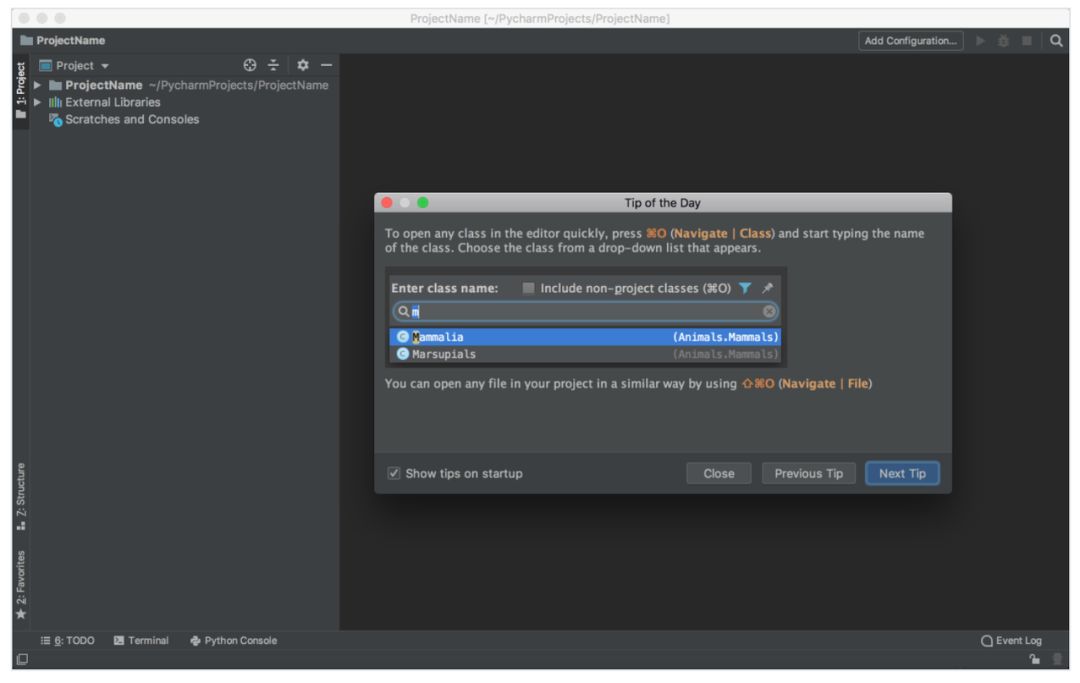 屏幕上出现「Tip of the Day」弹窗,在每次启动时 PyCharm 通过该弹窗提供 trick。关掉该弹窗。