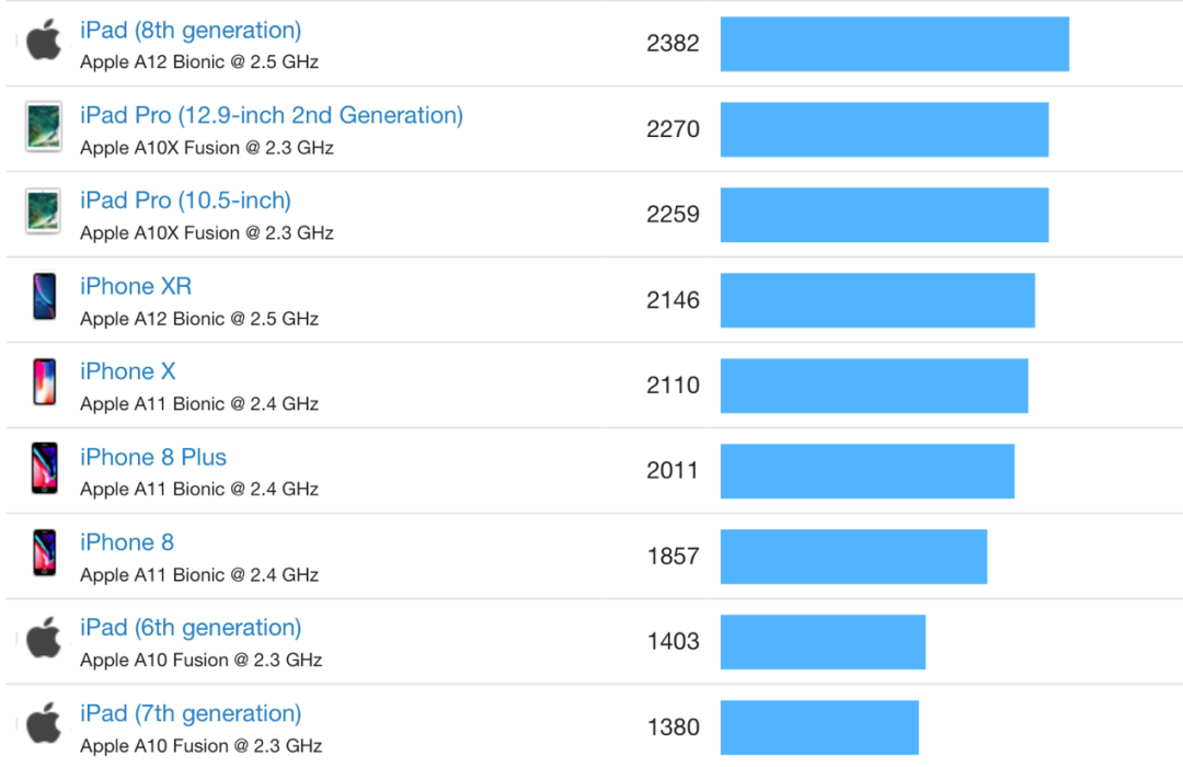 根据 GeekBench 5 的数据,搭载 A10 Fusion 的 iPad 多核得分大约是1400分,而搭载 A12 的 iPad,分数可以达到 2831,提升了几乎一倍,而面向图形处理能力的 Metal 得分,也有大约 65% 的提升。