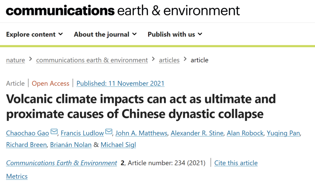 相关研究以“Volcanic climate impacts can act as ultimate and proximate causes of Chinese dynastic collapse”为题发表在最新一期的Communications Earth & Environment杂志上。