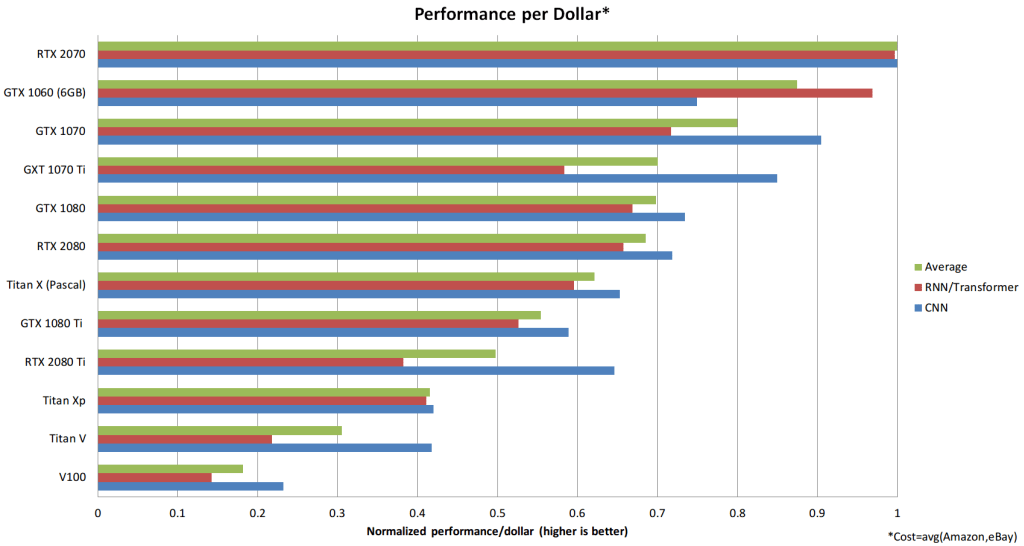 这种分析适合个人用户,它没有考虑到网络所需的内存和计算机能容纳的GPU数。例:装了4个高速GPU的计算机和装了2个高性价比GPU的计算机,肯定是前者总体性价比更高。