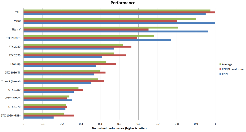各GPU和TPU的标准化原始性能数据(越高越好)