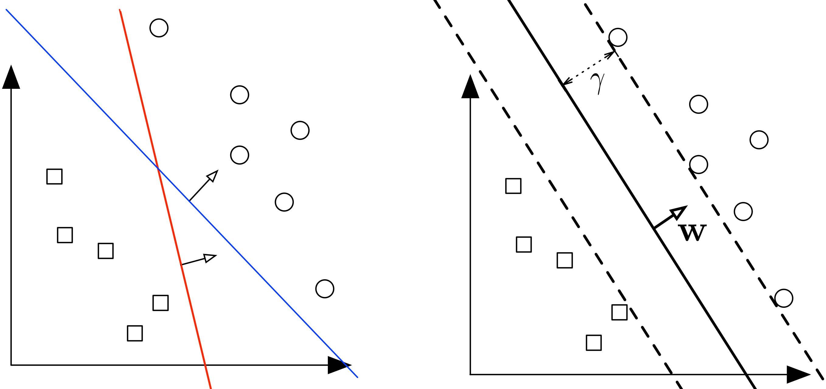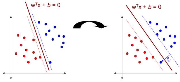 In the above data classes, there is a blue outlier. And if we apply Hard margin classification on this dataset, we will get decision boundary with small margin shown in the left diagram. To avoid these issues it is preferable to to use more flexible model. The objective is to find a good balance between keeping the street as large as possible and limiting the margin violation (i.e., instances that end up in the middle of the street or even on the wrong side). This is called Soft margin classification. If we apply Soft margin classification on this dataset, we will get decision boundary with larger margin than Hard margin classification. This is shown in the right diagram.