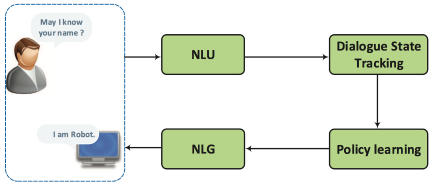 基于流程的任务型对话是相对较为传统的方法。这种任务型对话的系统通过一套Pipeline流程实现。如图3所示, 任务型对话系统的流程依次包括:自然语言理解、对话状态跟踪、对话策略学习,自然语言生成模块。具体的,用户输入自然语言,对话系统按流程依次完成:分析用户意图,更新对话状态,根据对话策略做出动作,生成最终的自然语言回复。