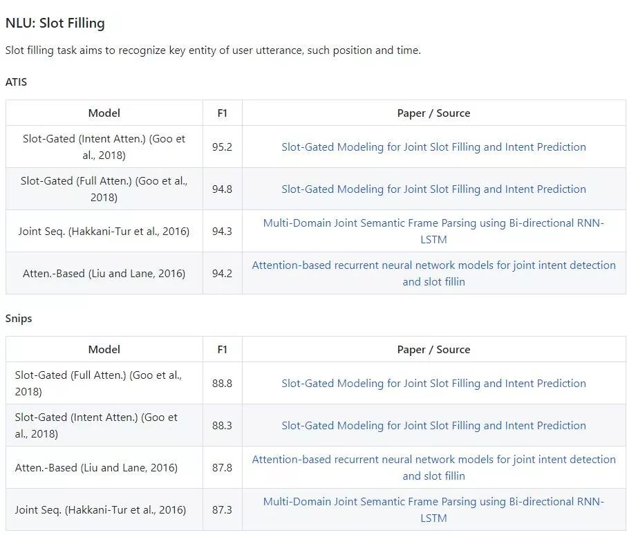 我们以Leaderboard 的形式展示了语义槽抽取(Slot filling),用户意图识别(Intent detection),对话状态跟踪(Dialogue state tracking)三个任务上的一些领先结果。具体形式如图5所示。