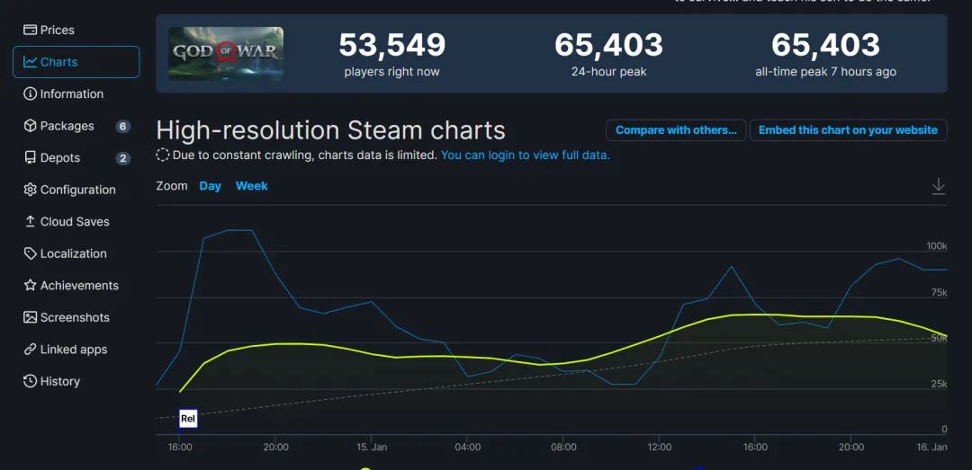 曾经的索尼独占大作《战神4》已经登陆PC平台,据SteamDB显示,在发售一天后,《战神4》Steam在线峰值有所上涨,从之前的4.9万攀升到了当前的6.5万(65403),打破了早前由《地平线:零之曙光》保持的记录:5.6万在线峰值。这仅是Steam的数据,《战神4》还登陆了Epic商城