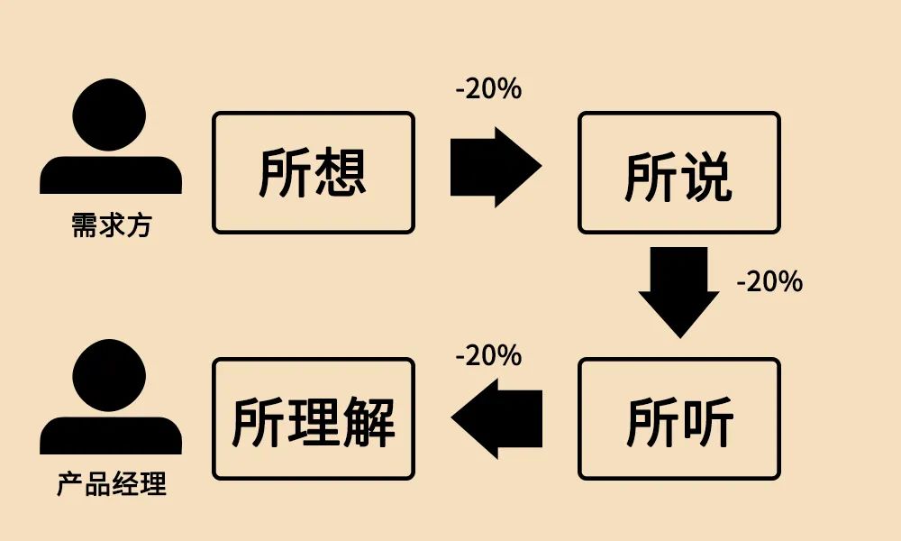 沟通法则里面沟通信息传递程序是:脑子里所想的、 所说的、所听到的、所理解到的,这四层每经过一层都会造成20%的信息遗失。所以需求方脑子里想到的东西,和你理解到的东西从原理上会有60%的信息丢失。