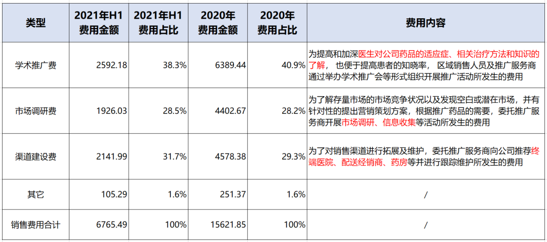 到了两票制实施后的2018年,西点药业整体的销售费用率增长至54.76%,这意味着:进账100元收入,要拿出55元用于维护终端。在招股书中,西点将销售费用拆分为三部分,分别是:学术推广费、市场调研费、渠道建设费。从下图的费用明细可见,最终服务落点的关键词包括:医生、市场营销、终端医院、药房、配送经销商。