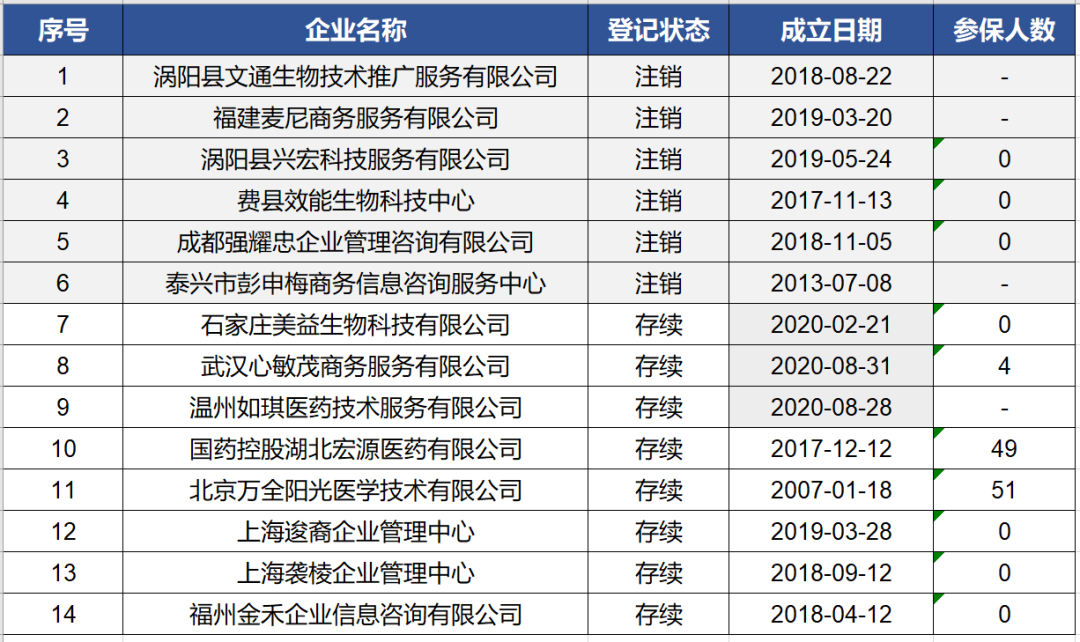 通过查询招股书中涉及的16家推广服务公司,查询到的14家企业中,6家已注销;存续的8家中,除了国控湖北宏源、北京万全阳光两家成立较早、且参保人员较多外,3家是2020年方才成立,多数无参保人员。