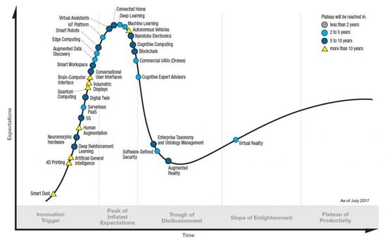 Gartner 给出的最新技术成熟度的图,也反映了不同技术的发展现状。网上流传的一句话说到,当某个领域的代表性人物获得了图灵奖,也就代表了这个领域辉煌时代的结束。2019 年 3 月 27 日,ACM 宣布,深度学习的三位创造者 Yoshua Bengio,Yann LeCun,以及 Geoffrey Hinton 共同获得了 2019 年的图灵奖。在曲线中,我们也看到深度学习处于曲线的最高峰,并且即将处于下降的趋势,也在一方面印证了随着大数据红利的消失,以深度学习为代表的感知智能也触碰到了天花板。