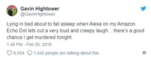 作为从业人员,我在使用这些产品的时候还是很宽容的,由于知道聊天机器人的软肋,就会尽可能的跟聊天机器人心平气和的对话。一次不行,我再试一次,这个指令不管用,我再换一种问法。但对于普通用户,可不会买账。我们看下如图 1 这个用户,冷不丁的半夜被聊天机器人的怪笑吓个半死。英文翻译过来的意思就是「躺在床上正要睡着了,突然某某某音箱中的虚拟助手向我发出很大声让人毛骨悚然的笑声... 今晚我要被杀了」。这个时候,如果是我的话,除了把它从楼上扔下去摔个粉碎之外,好像也没有什么平复心情的办法了。
