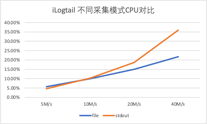 实验5:iLogtail 在 5M/s、10M/s、10M/s、40M/s 下的标准输出流采集性能。