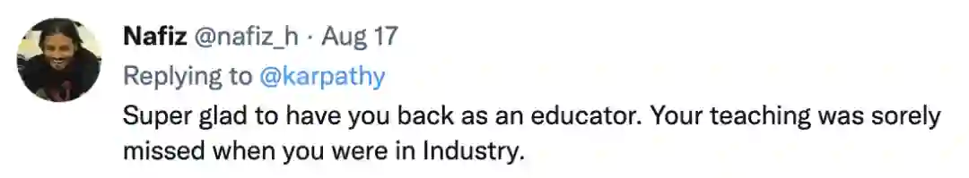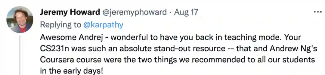 很开心你能再次回到教学模式,你的CS231n绝对是一个非常出色的课程。它和吴恩达的Coursera课程是我们早期向所有学生推荐的2个主要课程。