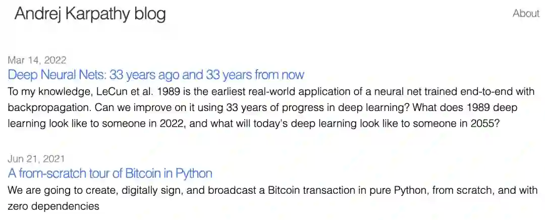 由于Karpathy本人十分喜欢研究神经网络,他在闲暇之余写了不少技术博客,并在Javascript中开发了多个深度学习库(如ConvNetJS、RecurrentJS、REINFORCEjs、t-sneJS)。