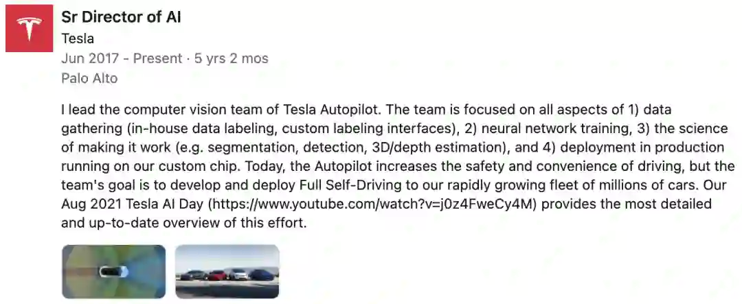 果然,在OpenAI只干了一年半,他就被马斯克挖去了特斯拉,接替苹果前高管 Chris Lattner,担任特斯拉人工智能和自动驾驶视觉总监(Director of AI and Autopilot Vision)。