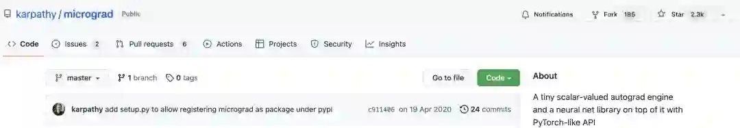 他先对micrograd进行了概述。micrograd是Kalpathy在2020年开源的一个项目,目前已经有2.3k星。