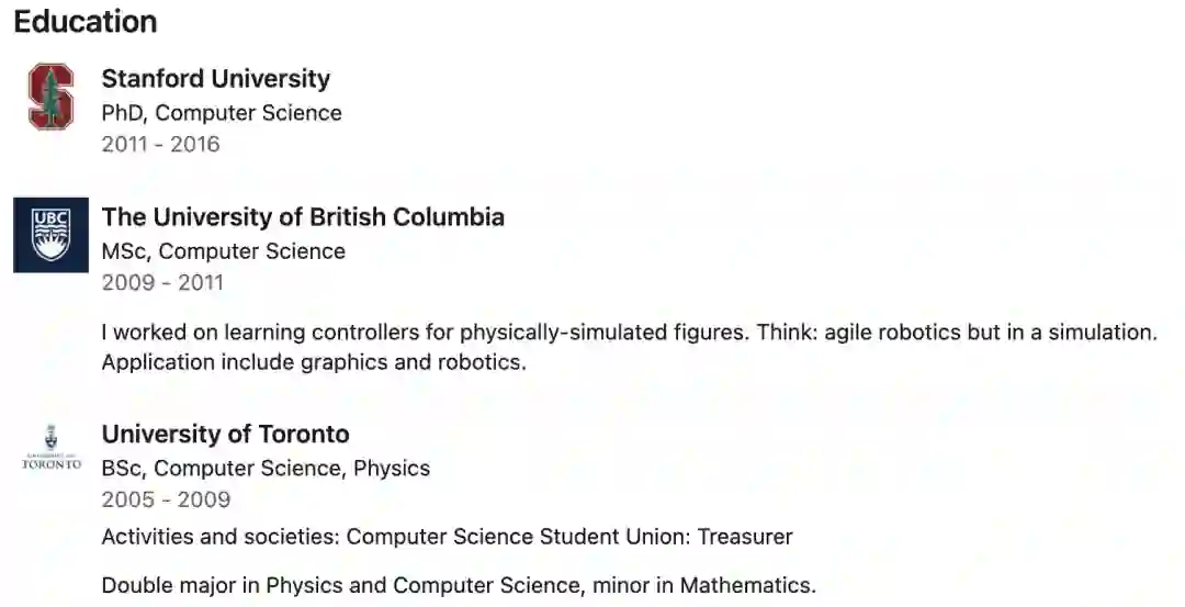 Karpathy师出名门,在2009年于多伦多大学获得计算机科学和物理学双专业学士学位,而后在2011年于英属哥伦比亚大学获得硕士学位,研究是物理模拟数字的控制器。