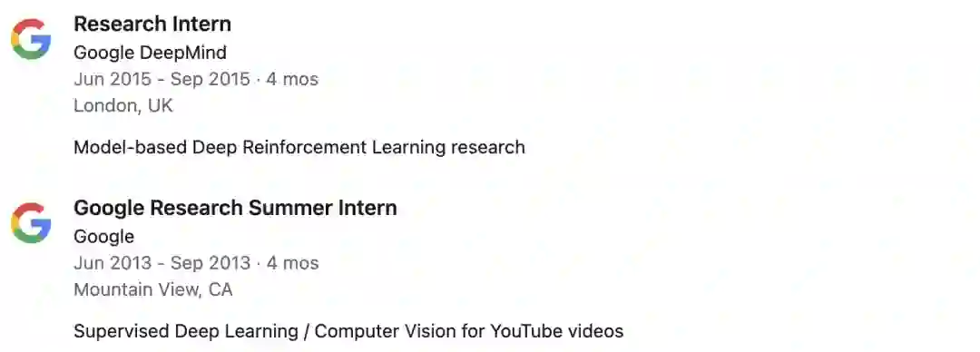 上学期间,他还跑去谷歌实习了——两次,还是出国的那种,在谷歌参与了深度学习与计算机视觉项目。