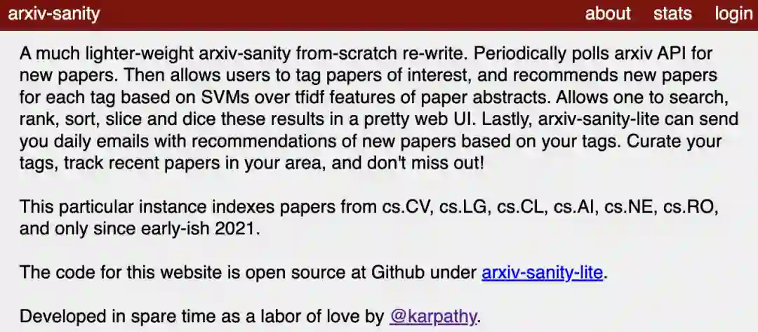 此外,他一有时间就会去维护自己「用爱发电」的arxiv-sanity,一个可以在过去6年里搜索和整理近10万篇关于机器学习arXiv论文的网站。